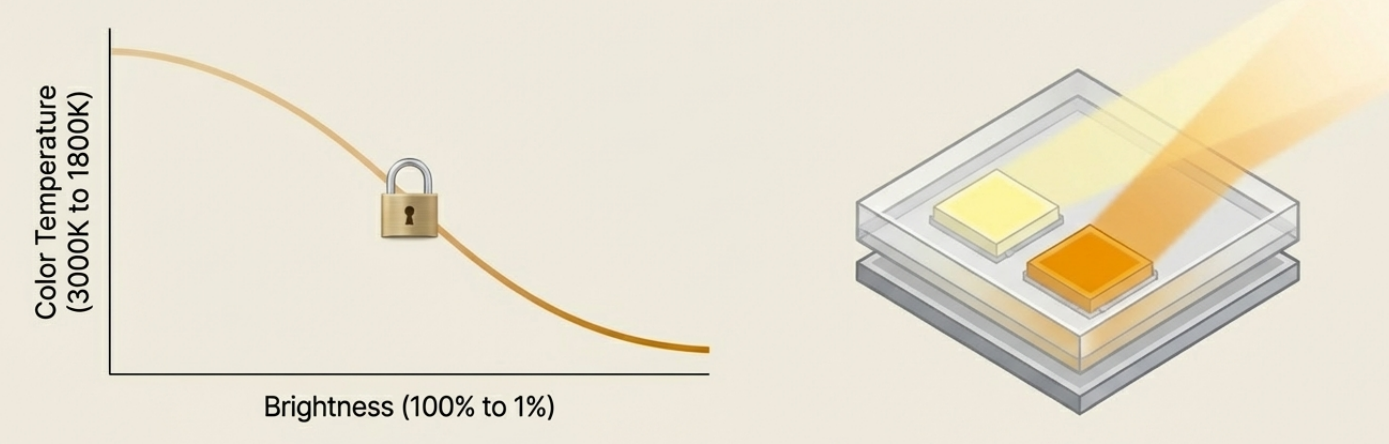 Inside the fixture, higher color temperature LEDs mix with ultra-warm LEDs (1800–2200K). The system alters their output ratio based on a fixed, factory-written brightness-to-CCT curve.