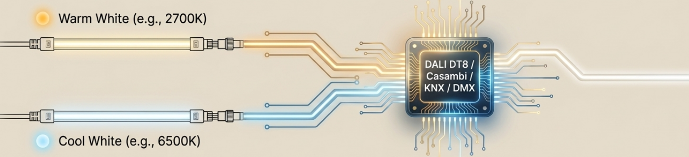 Unlike the fixed curve of DTW, Tunable White relies on real-time calculations. The control system acts as a brain, constantly mixing the warm and cool channels to hit the exact target CCT. Without a smart protocol, TW fixtures cannot function.
