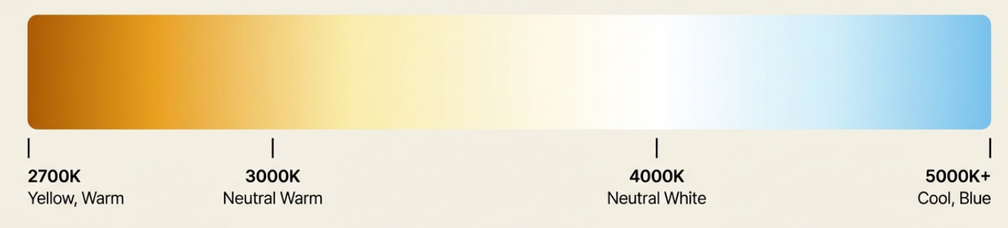 The Anti-Intuitive Rule: In the lighting world, we measure ‘white’ by referencing blackbody radiation. The lower the Kelvin (K), the warmer the visual feel. The higher the Kelvin, the cooler the light.