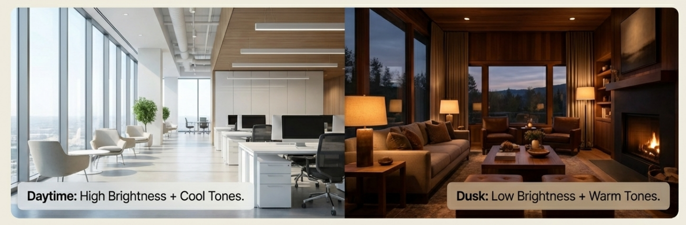 Our biological rhythms and emotions are deeply coupled with natural light shifts. Modern spaces require dynamic lighting that adapts to time, mood, and function.